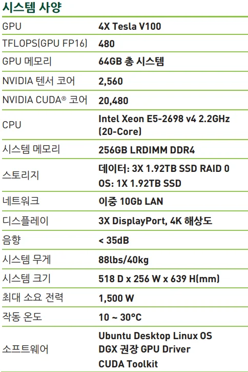 이 제품은 데이터 센터 수준의 컴퓨팅 성능을 워크스테이션 환경에서도 구현할 수 있도록 설계되었으며, 딥러닝과 AI 연구, 고성능 컴퓨팅(HPC) 작업을 수행하는 전문가들을 위해 개발되었습니다. DGX 시리즈 중에서도 유일하게 워크스테이션 형태로 제작된 모델로, 서버실이 아닌 사무실이나 연구실 환경에서도 효율적으로 운용될 수 있도록 설계된 제품입니다.
