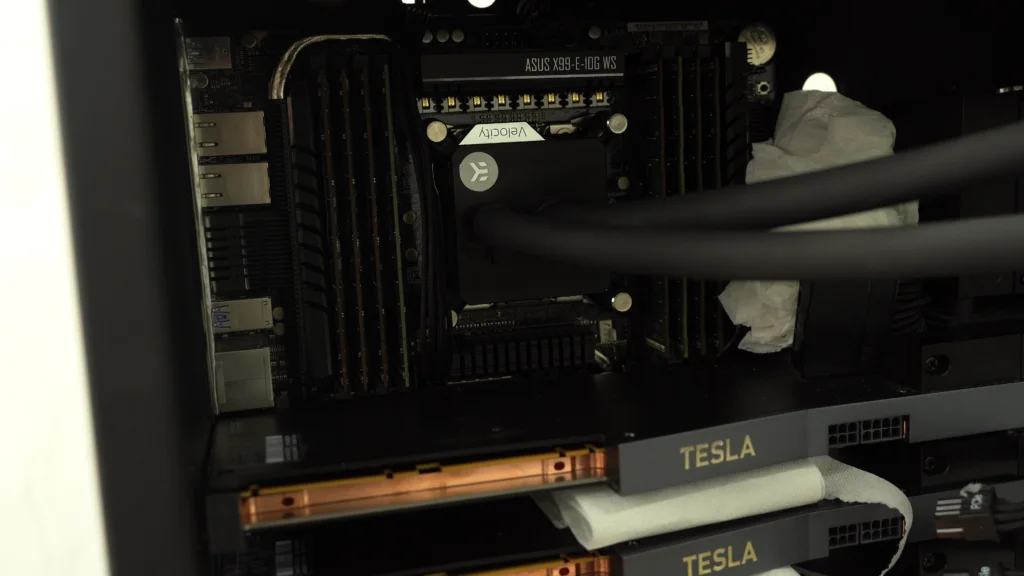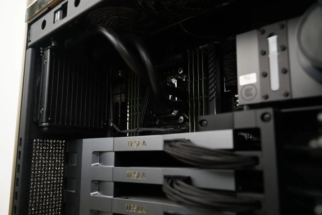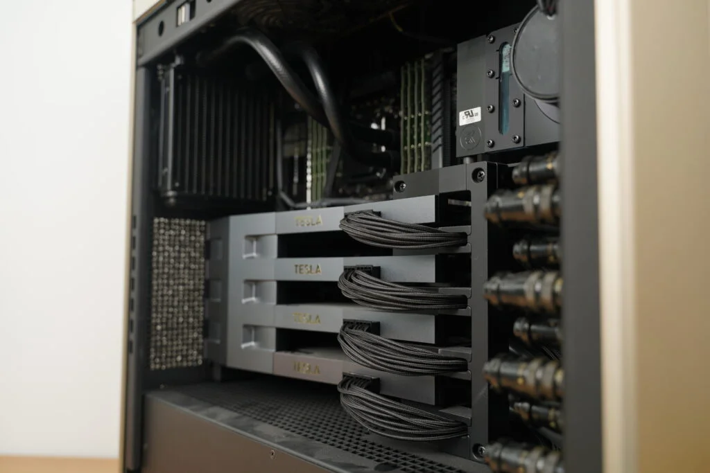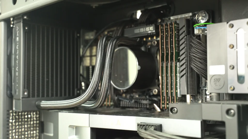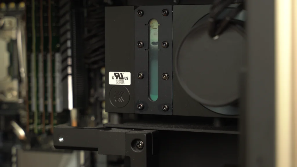 DGX STATION V100은 일반적인 서버 환경과 달리 사무실이나 개인 공간에서 사용할 수 있도록 설계된 워크스테이션입니다. 이에 따라 소음과 냉각 성능을 고려해 수냉식 냉각 시스템이 적용되었습니다.