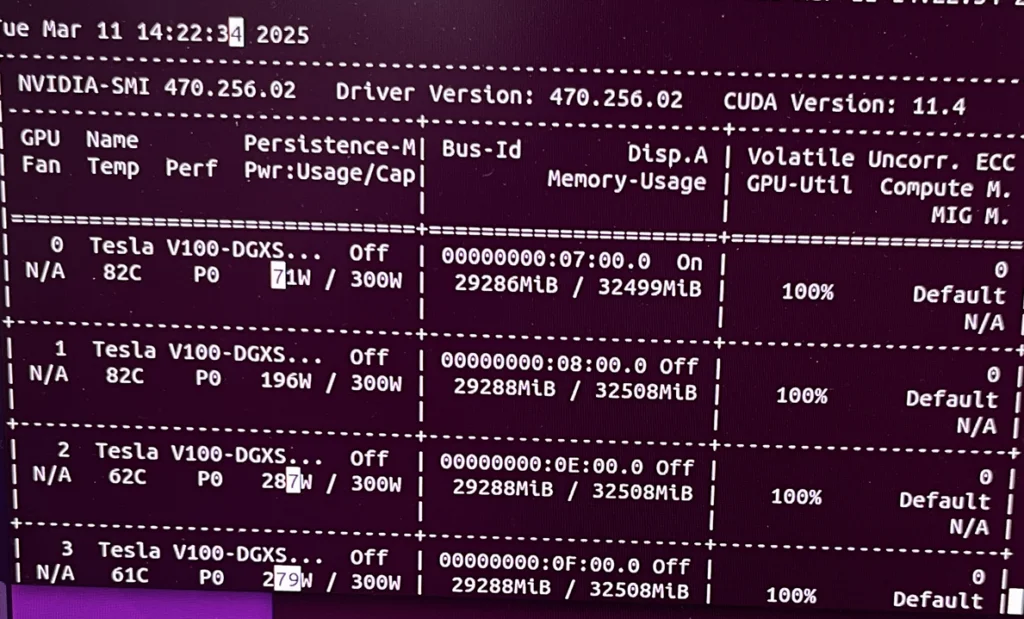 GPU 냉각 시스템의 문제로 인해 과열이 발생해 시스템이 셧다운되거나 쓰로틀링이 걸리는 현상이 발생합니다. 실제로 0,1번 GPU의 경우에는 온도로 인해서 전력양도 떨어질 뿐더러, 제대로 된 성능을 내지 못하고 있음을 볼 수 있습니다.