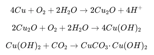 구리(I) 산화물(Cu₂O)이 형성된 후, 추가적인 산소와 반응하면서 수산화구리(Cu(OH)₂)로 전환된 후에 냉각수에 용해되면서 청록색 또는 초록색 변색을 유발하고, 시간이 지나면서 탄산구리(CuCO₃·Cu(OH)₂, 녹청)로 변했다고 생각됩니다.