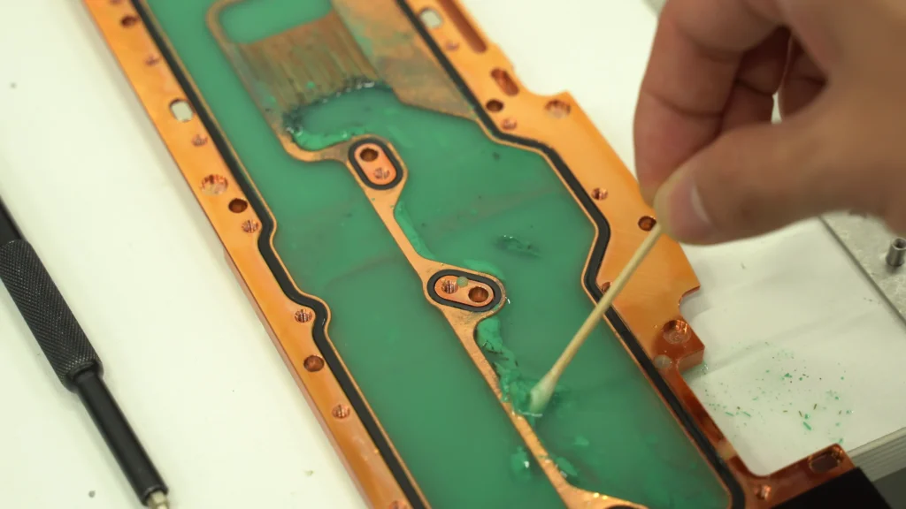 저희는 이러한 문제를 해결하기 위해 약품 처리와 세척을 통해 워터블럭 내부 수로와 미세 수로 (핀)의 이물질을 완전히 제거하는 작업을 진행하고 있습니다. 이를 통해 냉각 성능을 회복시키고, 시스템이 정상적으로 동작할 수 있도록 복원합니다.
