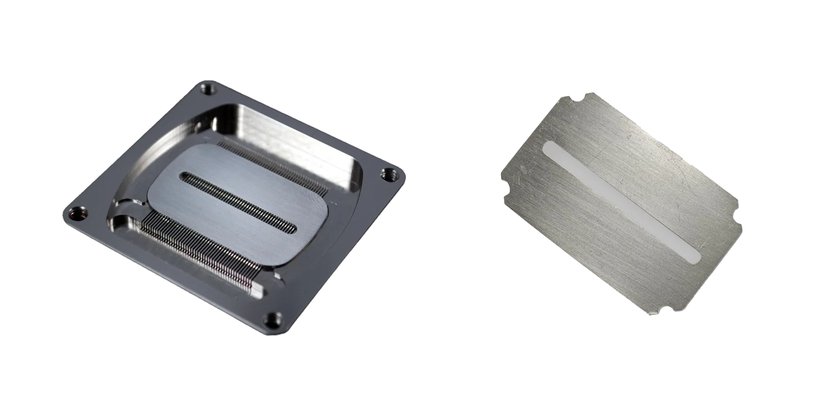 저 면도날 같이 생긴 건 제트 플레이트(Jet Plate)라는 워터블록의 파츠 중 하나인데요, 미세수로(Micro-channel) 위에 위치하며 제트 플레이트는 워터블록으로 들어오는 냉각수의 흐름을 좁은 구멍(노즐)을 통해 가속시켜 미세수로에 고압으로 분사되게 합니다. 빠르게 흐르는 냉각수는 미세수로와 접촉하는 표면의 열 전달 효율을 극대화합니다.