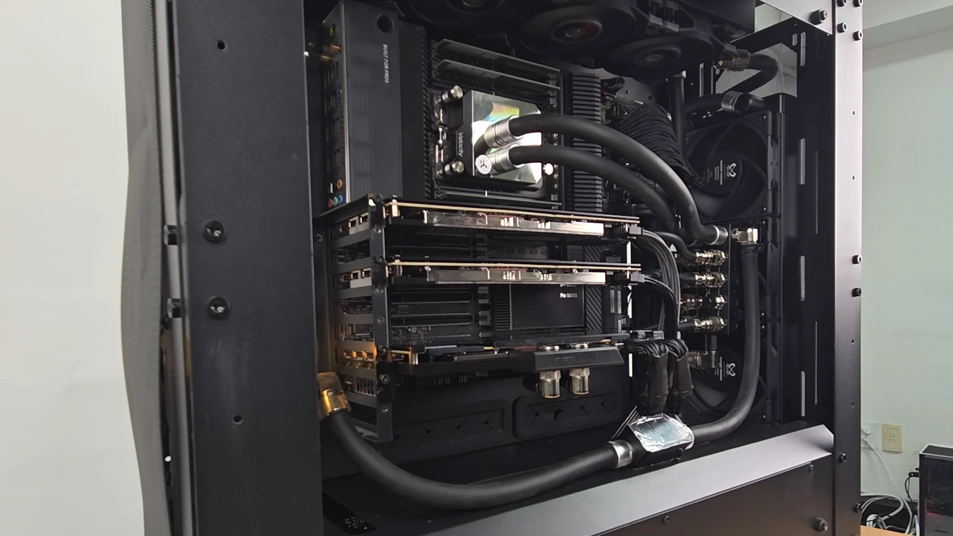 장시간 사용으로 인한 열 누적 때문에 3090 칩셋에 어느 정도 손상이 누적되었을 가능성이 있고, 향후 GPU의 추가 장착과 유지 보수를 더욱 용이하게 하기 위해 매니폴드 (Manifold) 를 이용한 병렬식 구조로 변경하여 최종적으로 조립을 마무리합니다.